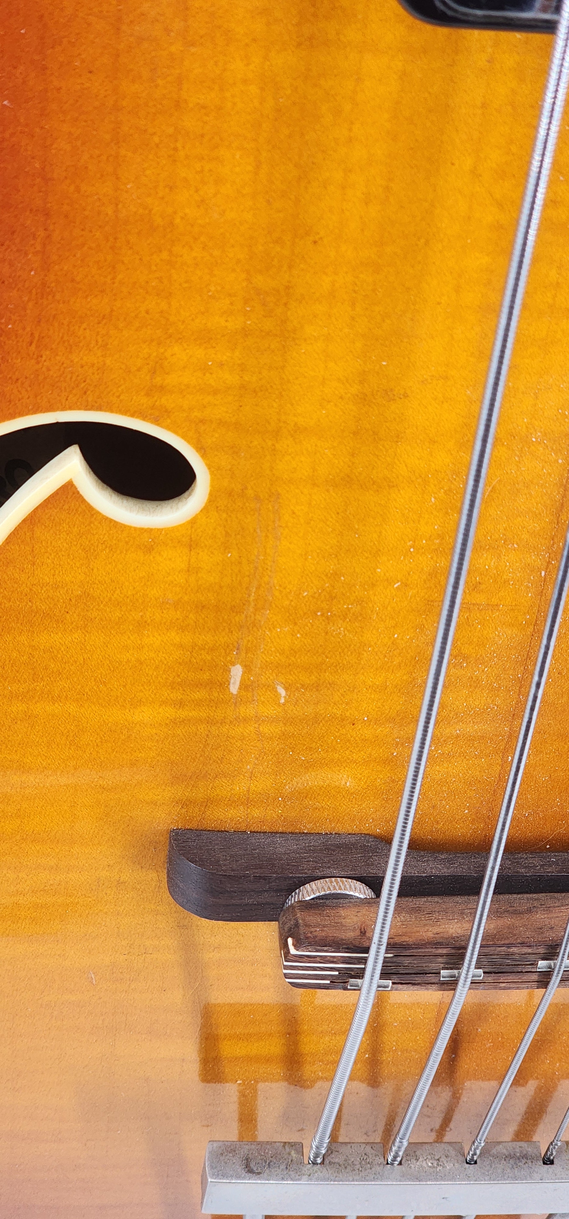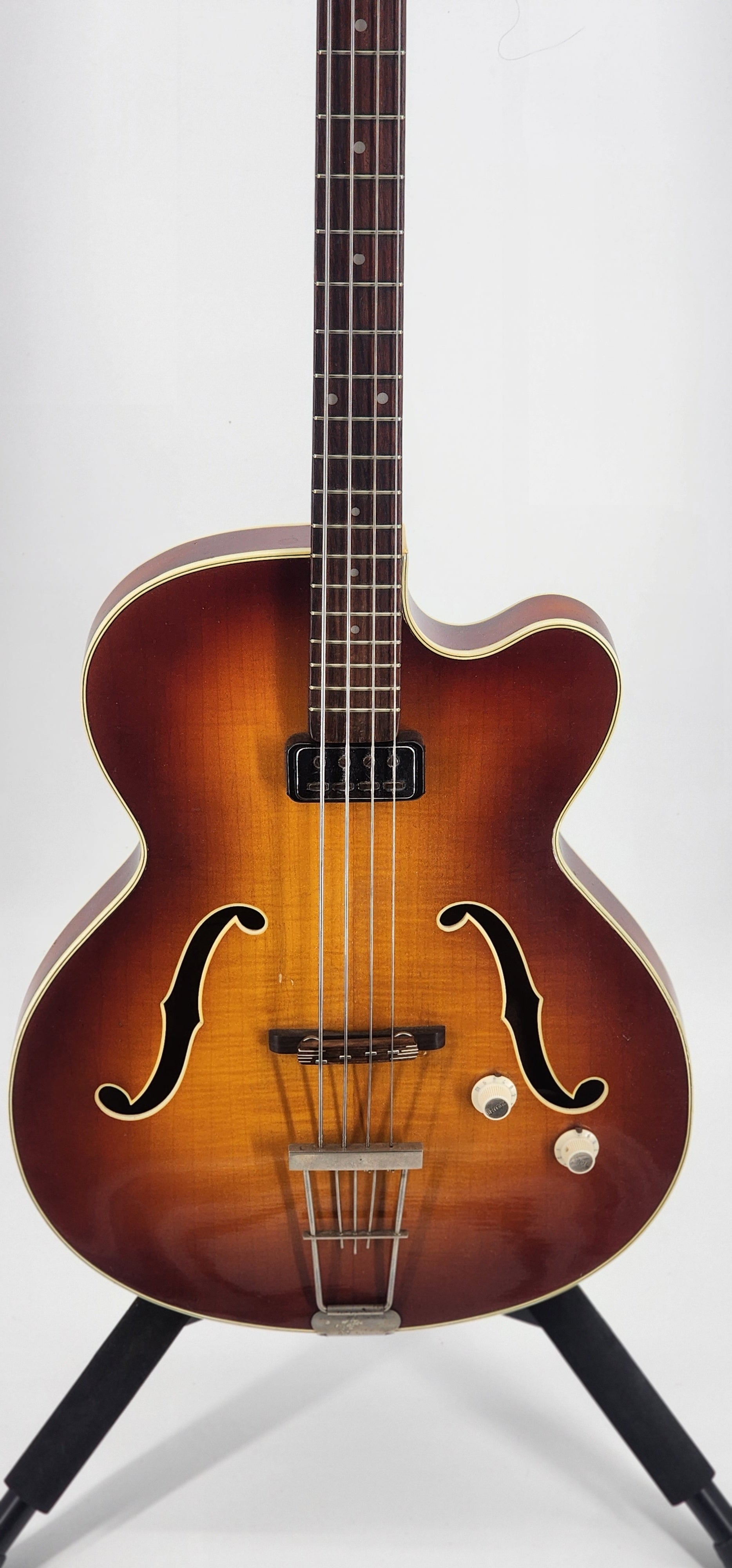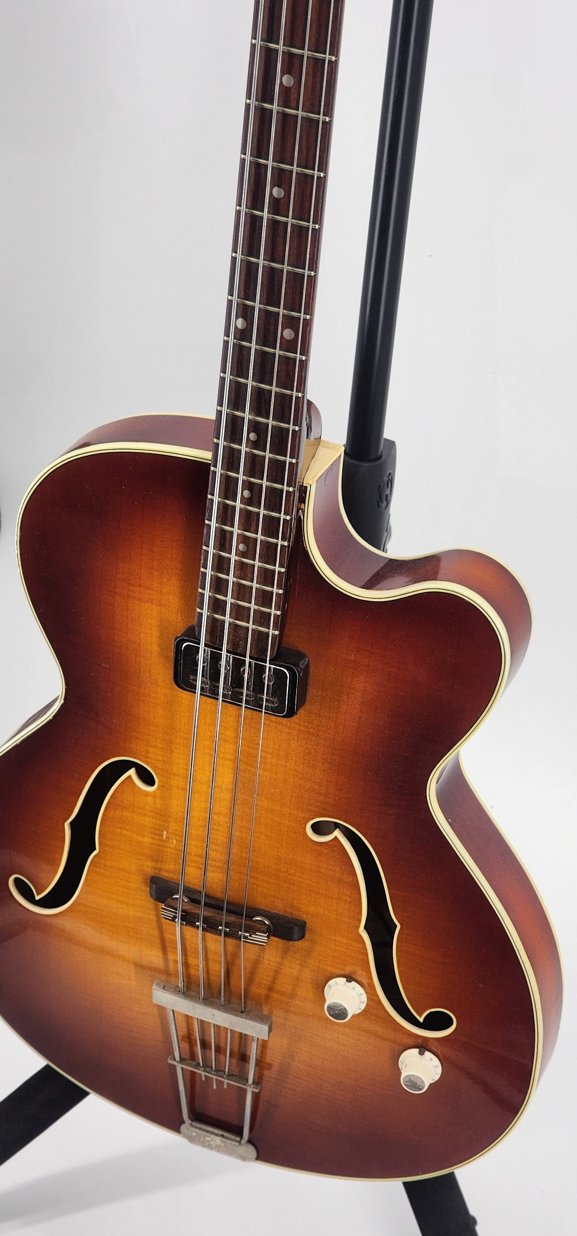 Nothing but good news on this one! Issue free, no repairs! The heel is just fine for a change. Neck is straight, correct neck pitch with low action. Good truss rod, good electronics. Small surround and staple pickup. All parts are orig. Has a newer Hofner case. 4.7 lbs. Only thing to mention is a 3rd strap button. This is a good one.