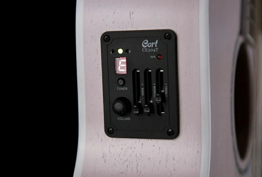 All Mahogany Body-Developed in accordance with recent acoustic guitar market trends, this model features not only mahogany back and sides but mahogany top as well. Although darker sounding than spruce, mahogany produces a warmer tone with a full rich mid-range. Small Body & Deep Cutaway-Designed with the female players and children in mind, the smaller body is comfortable for extended playing sessions and the deep cutaway makes accessing the high frets a breeze. Pearloid Design-Inspired by the look of the 50's and the 'rock n roll' era, the pearloid design applied to headstock and pickguard adds sparkle and uniqueness to the guitar that is opposite of conventional. Cort CE304T-Includes a 3-band EQ for tonal flexibility and a built-in LED tuner for convenience. This high-value EQ system delivers a rich midrange with clear transparent highs. Vintage Machineheads-Relatively lightweight open gear tuners (18:1 tuning ratio) makes the tuning process a breeze. Scooped Bridge-The exclusive scooped surface bridge from Cort enhances sustain with greater string angle from the saddle to the body while reducing tension on the strings across the neck were less finger fatigue and improved playability.