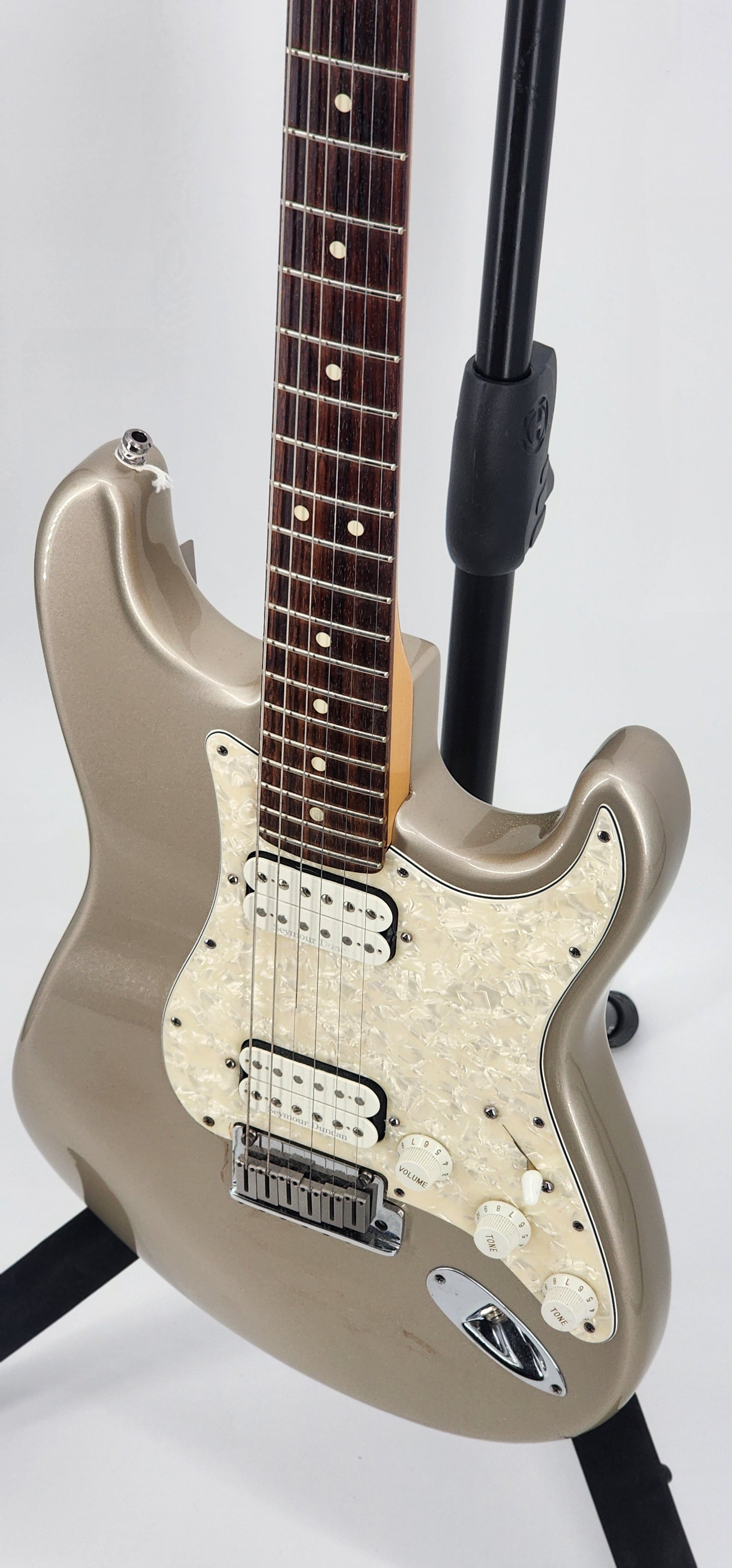 The 1998 Fender American Big Apple Stratocaster in Gold Mist (technically Shoreline Gold) was part of Fender's "Hot Rodded" series, featuring dual Seymour Duncan humbuckers (a '59 in the neck, Pearly Gates in the bridge) for versatile rock tones, often with a hardtail bridge or tremolo, and known for its solid alder body, maple neck with rosewood fretboard, and "super switch" for coil-splitting, making it a powerful, modern take on the classic Strat.