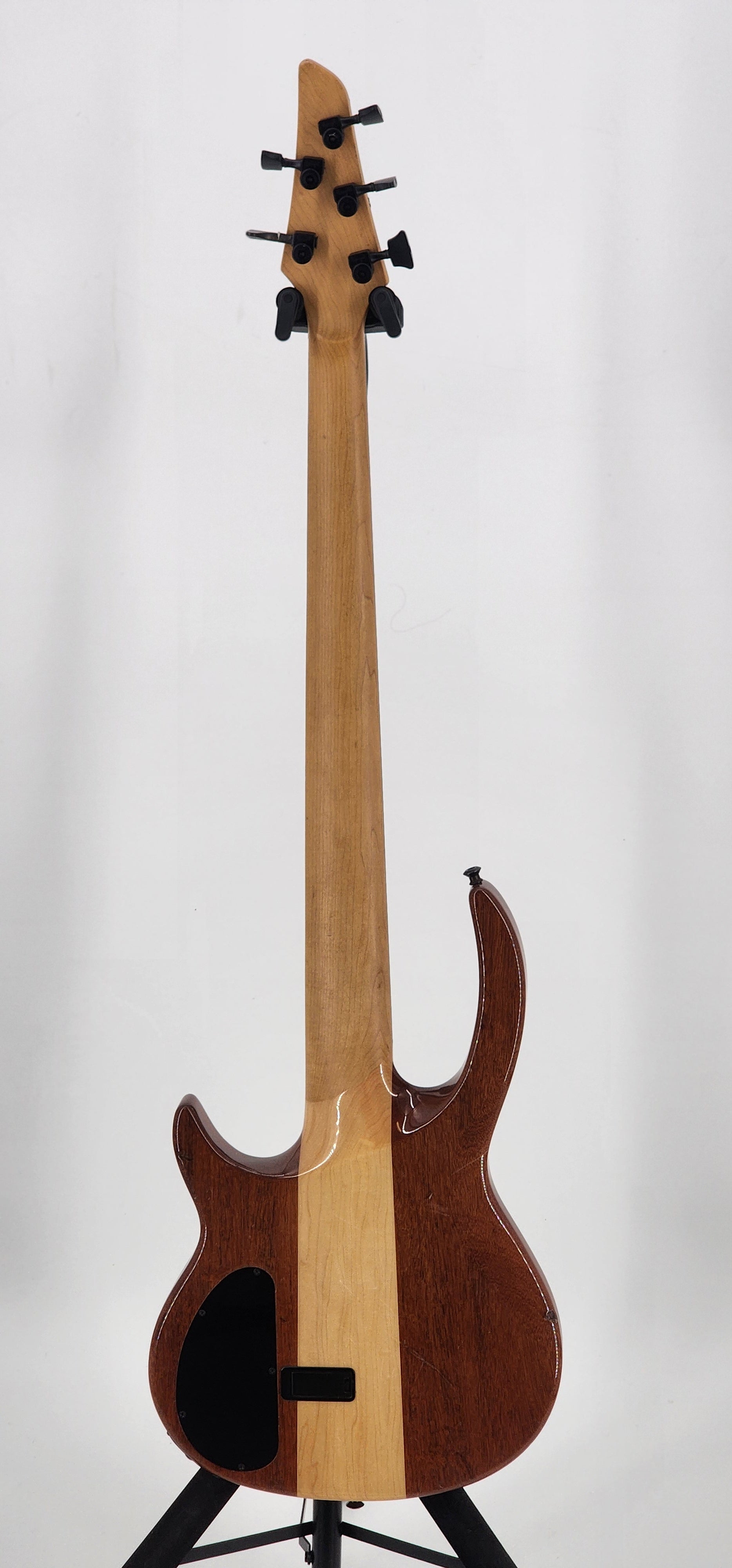 The 1995 Carvin Bunny Brunel (BB75) 5-string bass, often featuring a natural mahogany or walnut body, is a high-end signature instrument from the mid-90s known for its neck-through construction and advanced electronics. It features 24 medium-jumbo frets, an ebony fingerboard, and a distinctive, slightly thinner body design for that era, with the input jack located on the front.