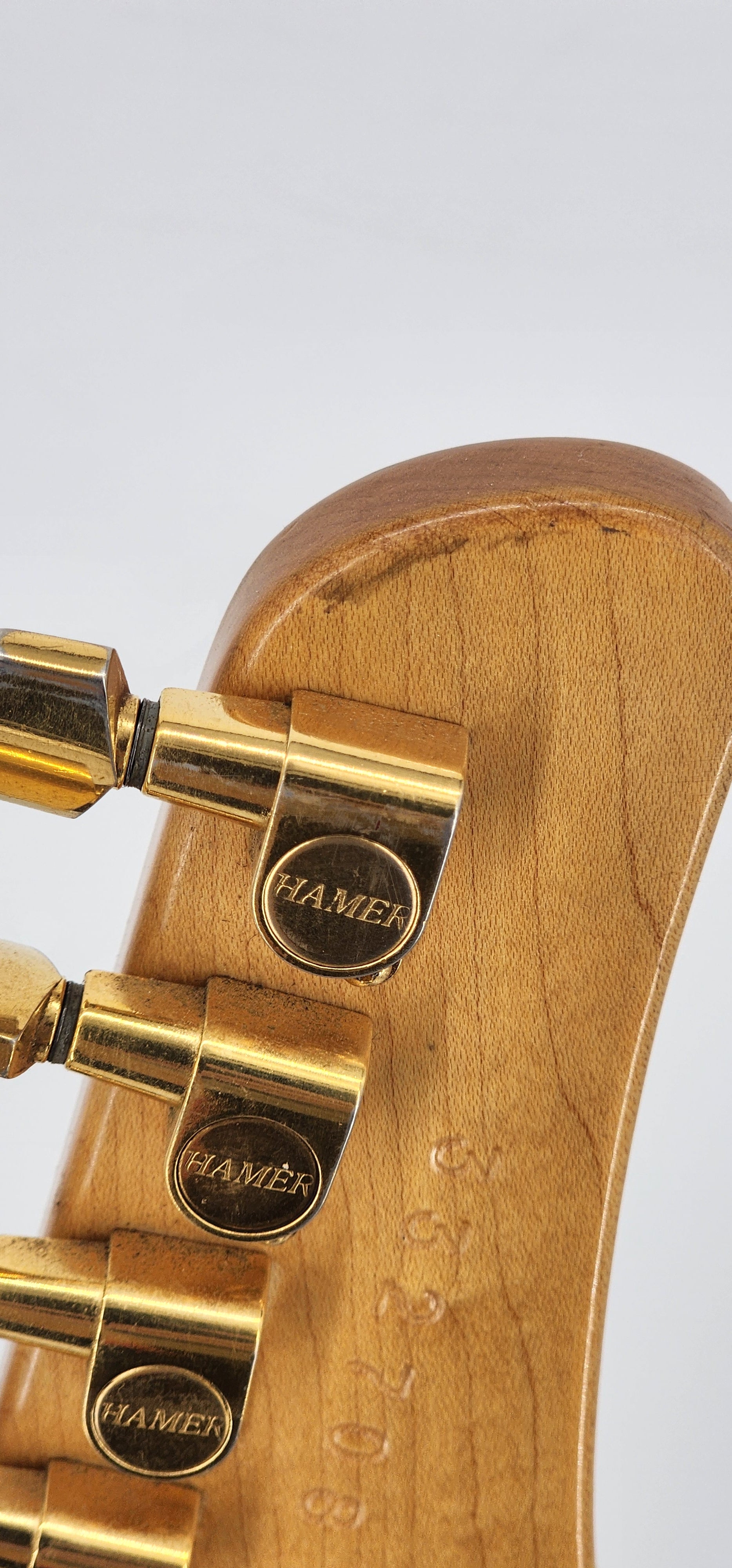 Vintage 1990s Hamer Diablo in stunning Emerald Green—an iconic shredder's guitar with sleek curves and killer tone. This solid-body electric guitar features a double-cutaway design, a maple neck with a 24-fret rosewood fingerboard, and a fast-playing profile perfect for lead work. Equipped with high-performance humbuckers, it delivers powerful, articulate tones suited for rock and metal. The Floyd Rose tremolo system ensures dive-bombing stability, while the ergonomic body allows for effortless playability. This Diablo is in good condition, showing honest wear from years of playing but still delivering exceptional performance. Whether you're a collector or a player looking for a reliable, high-quality 90s-era instrument, this Hamer Diablo is a fantastic choice. Made in the USA.