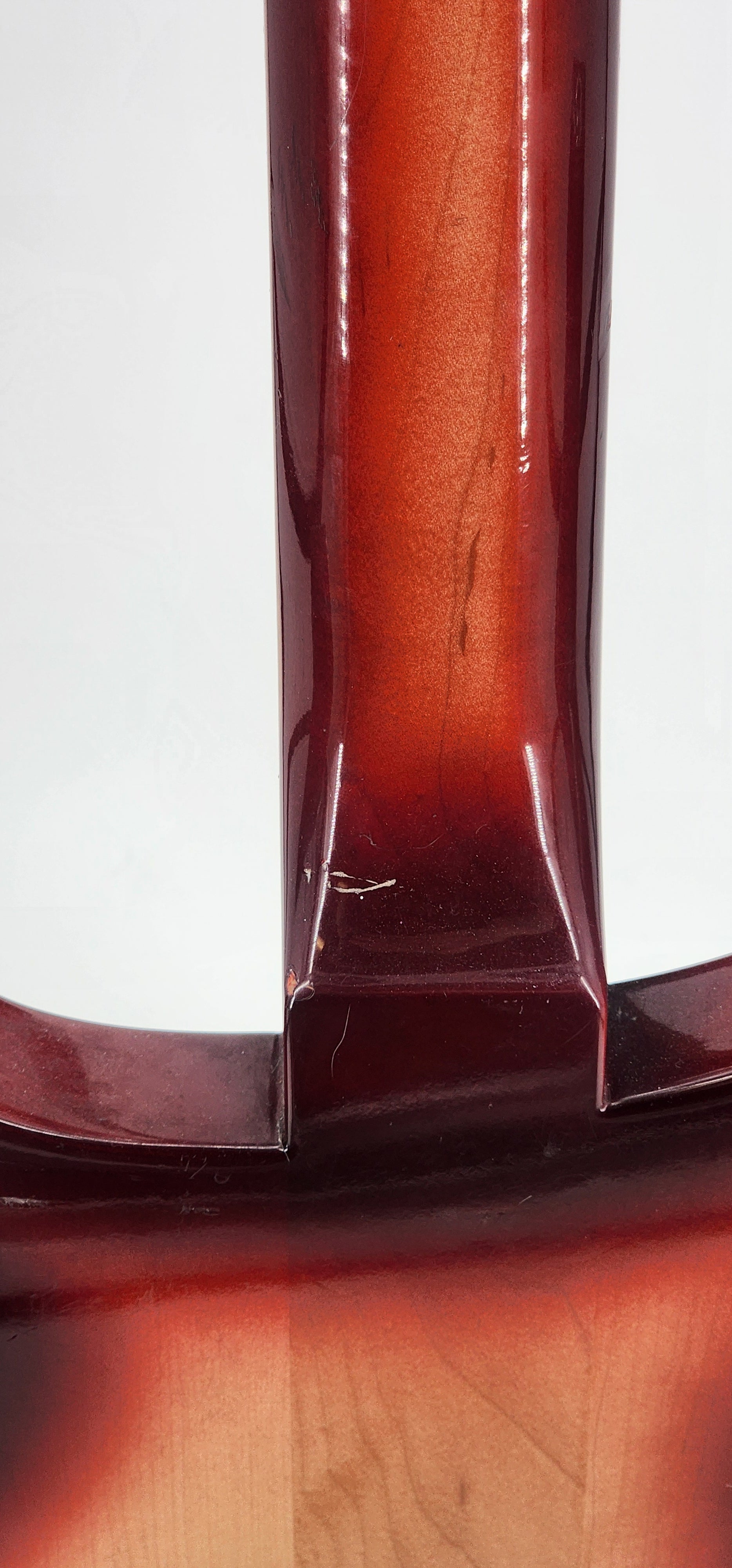 We have a v63 in Fireglo for your consideration. Lifelong wearer of flats and we just put on a set of killer Thomastics. Shows player wear and patina as this bass was gigged. We received this with some jivey mirror guard for a typical 4003/4001 and we installed the original guard. The mirror guard left a few holesunder the guard. The silver case is long gone as is the horseshoe cover but the pickup is original. We received this in a cheap gigbag and put it in a big dollar Gator case.