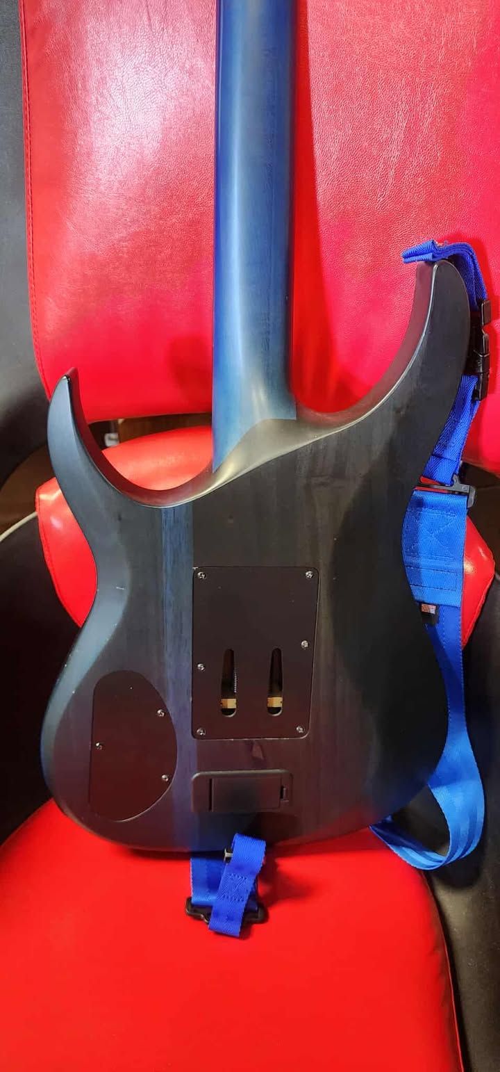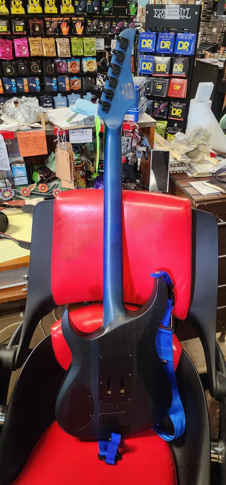 Very Good Condition, Stamped “2” on back of headstock, Satin Trans Blue, Flame Maple top on a Mahogany body, 14” radius Ebony fingerboard with the Offset/Reverse Roman Numeral inlays and jumbo frets, Ultra thin U shaped set-in w/ultra access three piece Maple neck that has the carbon fiber reinforcement rods, 25.5″ scale length, 1.625” nut width, EMG 81 bridge and EMG 60 neck pickups, Volume/Tone and 3-way switching, Floyd Rose Special ‘Hot Rod’ locking tremolo, Schecter tuners, has a custom kill switch built in.